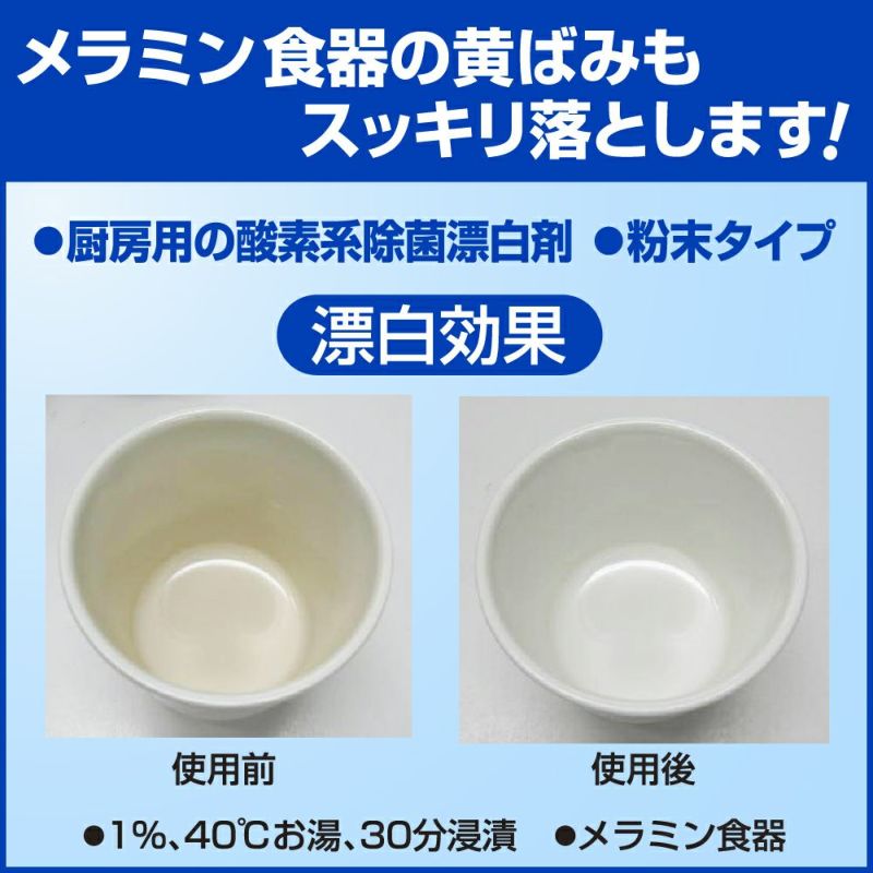 酸素系のためメラミン食器、色物・柄物のふきんやおしぼりにも安心して使えます。