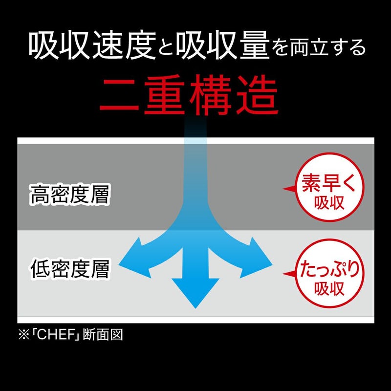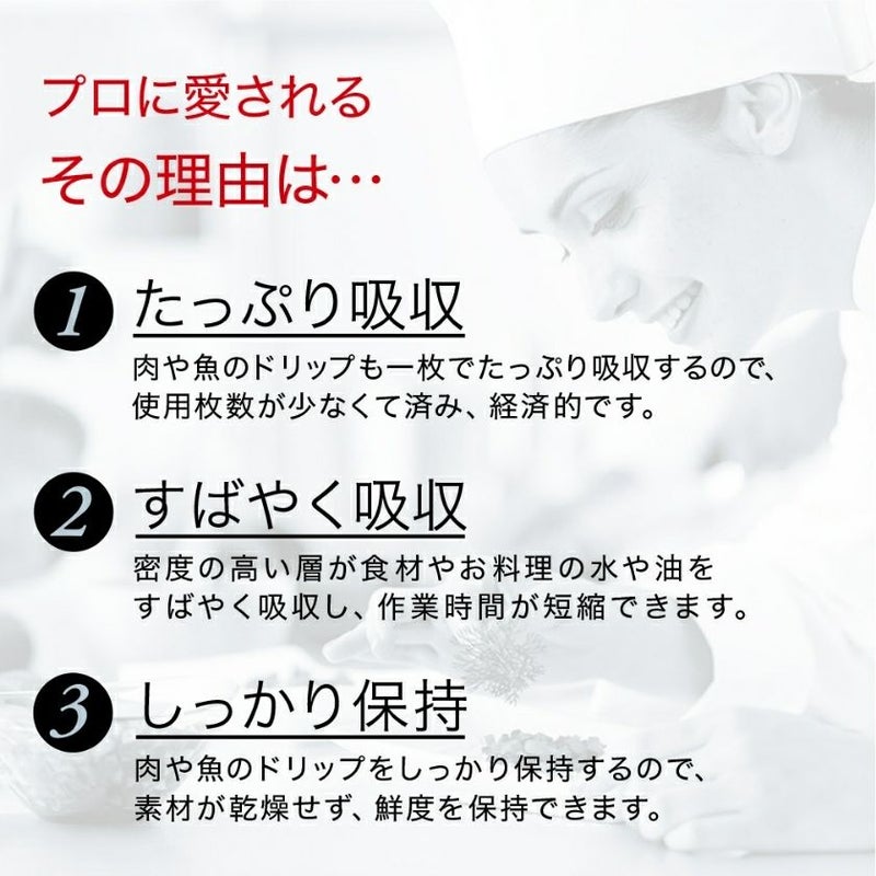 密度の高い層が食材やお料理の水や油をすばやく吸収し、作業時間を短縮できます。