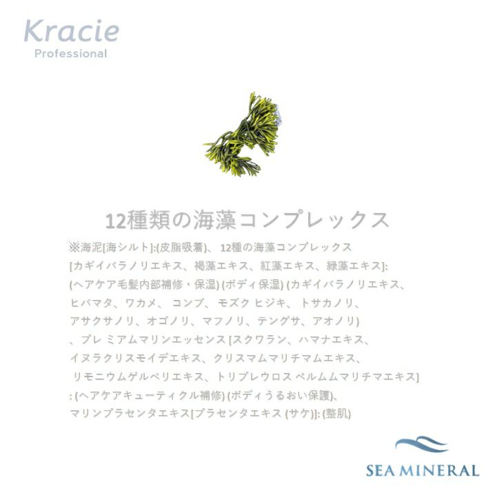 水、ラウレス硫酸Na、コカミドプロビルベタイン、ヤシ油脂肪酸PEG-7グリセリル、ラウロイルメチルアラニンNa、コカミドMEA、ジステアリン酸グリコール、海シルト、カギイバラノリエキス、褐藻エキス、紅藻エキス、緑藻エキス、シクワラン、ハマナエキス、イヌラクリスモイデエキス、クリスマムマリチマムエキス、リモニウムゲルベリエキス、トリプレウロスペルムムマリチマエキス、ジメチコン、ポリクオタニウム-10、クエン酸、グアーヒドロキTA-2Na、安息香酸Na、硝酸Mg、メチルクロロイソチアゾリノン、メチルイソチアゾリノン、香料、黄5、緑201