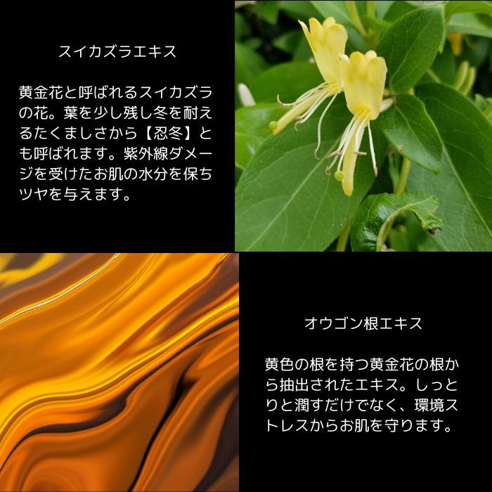水、グリセリン、ミネラルオイル、エチルヘキサン酸セチル、オウゴン根エキス、スイカズラ花エキス、ソルビトール、ポリソルベート60、ステアリン酸、セテアリルアルコール、水酸化K、(アクリレーツ/アクリル酸アルキル(C10-30))クロスポリマー、パラフィン、キサンタンガム、テトラオレイン酸ソルベス-30、セスキオレイン酸ソルビタン、BG、エタノール、フェノキシエタノール、メチルパラベン、プロピルパラベン、黄4、緑201、香料